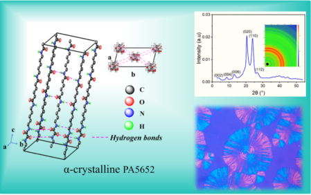 貴大新聞網訊(材料與冶金學院)近日,我校材料與冶金學院劉玉飛特聘教授團隊在生物基聚酰胺材料研究領域取得重要突破,相關成果以 Biobased Polyamide 5652 with α?Crystal Form: Characterization and Low Moisture Absorption為題,發(fā)表于高分子領域頂級期刊Macromolecules(自然指數期刊,中科院一區TOP)。貴州大學材料與冶金學院為論文第一完成單位,材料與冶金學院2022級碩士研究生王艷平為第一作者,劉玉飛特聘教授為通訊作者。近年來,生物基聚酰胺56(PA56)因其原料可再生、低碳環(huán)保而備受關注,但其特殊的分子結構(戊二胺單元含奇數碳原子)導致其晶體通常以γ晶型為主,飽和吸水率高達12%以上,在潮濕環(huán)境中力學性能顯著下降(如拉伸強度降低20%-30%),嚴重限制了在精密工程領域的應用,而傳統改性方法往往以犧牲材料其他性能為代價。針對這一難題,劉玉飛特聘教授創(chuàng)新性地提出了雙氫鍵結構調控策略:自主合成關鍵單體,設計并成功合成新型565二胺單體(C16H34N4O2),將565二胺與草酸二丁酯通過溶液聚合及